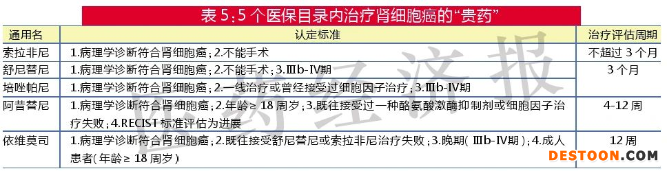共有5個口服靶向藥對應(yīng)適應(yīng)癥為腎細胞癌,主要對應(yīng)的進展為Ⅲb-Ⅳ期,治療評估周期基本不超過3個月。